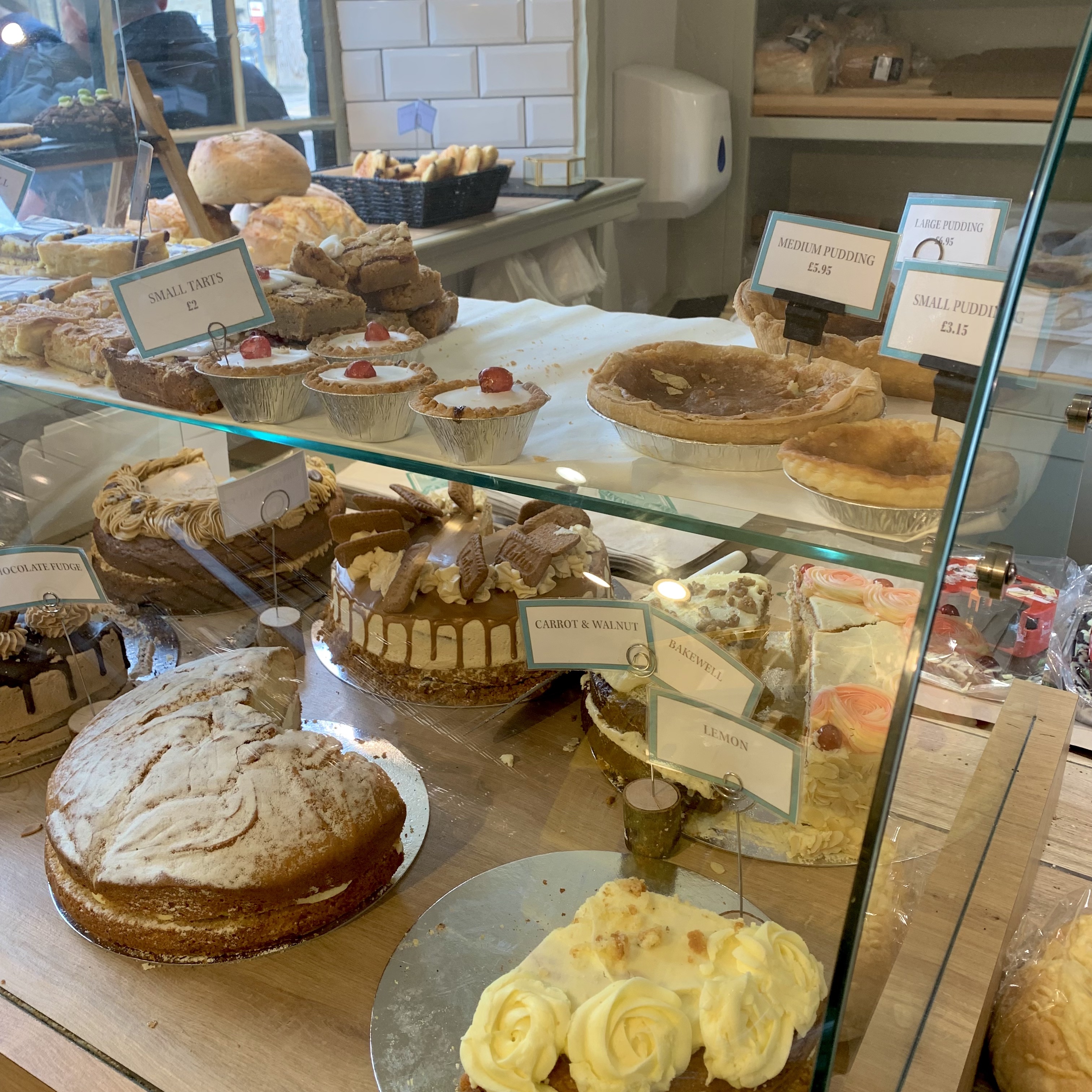 나는 베이크웰 푸딩을, 조던은 베이크웰 타르트가 이 지역의 유명한 디저트라고 서로 다르게 알고 있었는데, 솔직히 그냥 이름만 다르지 한 종류를 뜻하는 줄 알았다. 하지만 알고 보니 베이크웰 푸딩은 파이 타르트 모양이었고 베이크웰 타르트는 흰색 아이싱과 빨간 체리 조각이 올려진 타르트였다. 줄 서서 기다리는 동안 서로의 것을 사야한다고 이야기하다가 결국 작은 사이즈로 두 가지 모두 사기로 함ㅋㅋㅋ